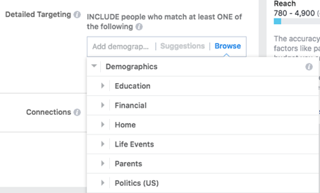 Behaviors: The old adage “actions speak louder than words” comes to life when you can target people based on their previous online behavior including purchasing behavior, how they use the internet and if they have an anniversary coming up.